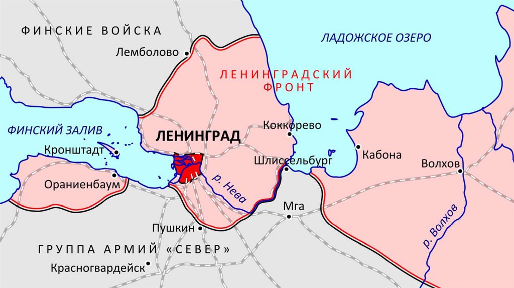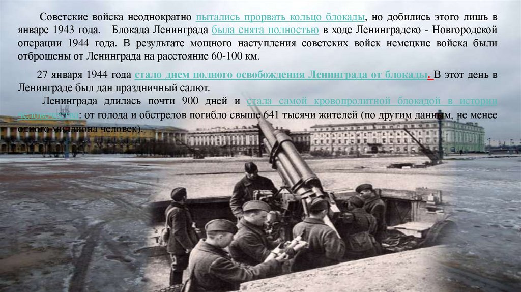 Советские войска неоднократно пытались прорвать кольцо блокады, но добились этого лишь вянваре 1943 года. Блокада Ленинграда была снята полностью в ходе Ленинградско - Новгородской