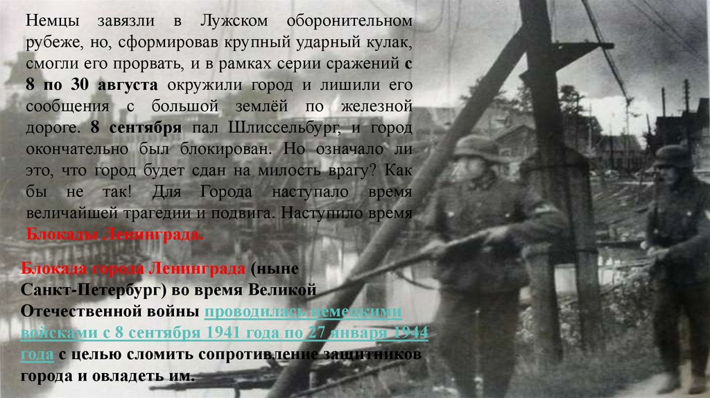 В сентябре немцы попытались сжать тиски блокады и затем взять Ленинград. Городпотерял все свои предместья, но, благодаря храбрости солдат и офицеров Красной