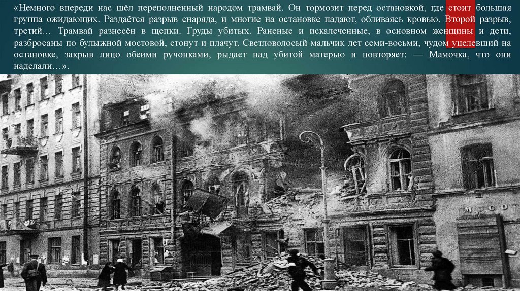 «Немного впереди нас шёл переполненный народом трамвай. Он тормозит перед остановкой, где стоит большаягруппа ожидающих. Раздаётся разрыв снаряда, и многие на остановке падают, обливаясь кровью. Второй разрыв,