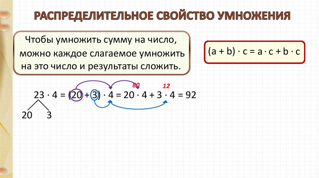23 ∙ 4 = (20 + 3) ∙ 4 = 20 ∙ 4 + 3 ∙ 4 = 92