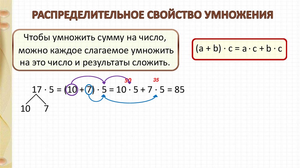 17 ∙ 5 = (10 + 7) ∙ 5 = 10 ∙ 5 + 7 ∙ 5 = 85
