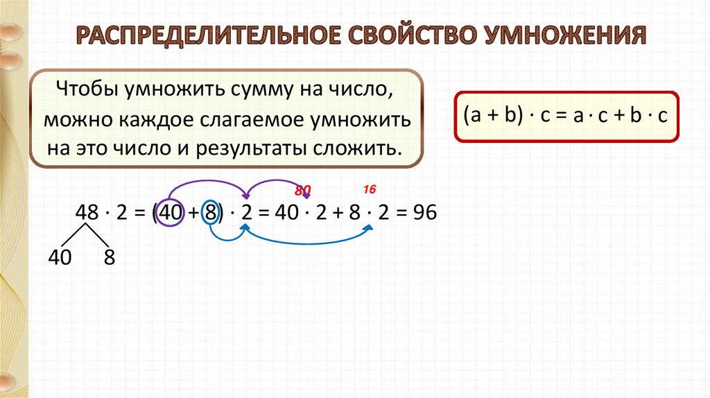48 ∙ 2 = (40 + 8) ∙ 2 = 40 ∙ 2 + 8 ∙ 2 = 96