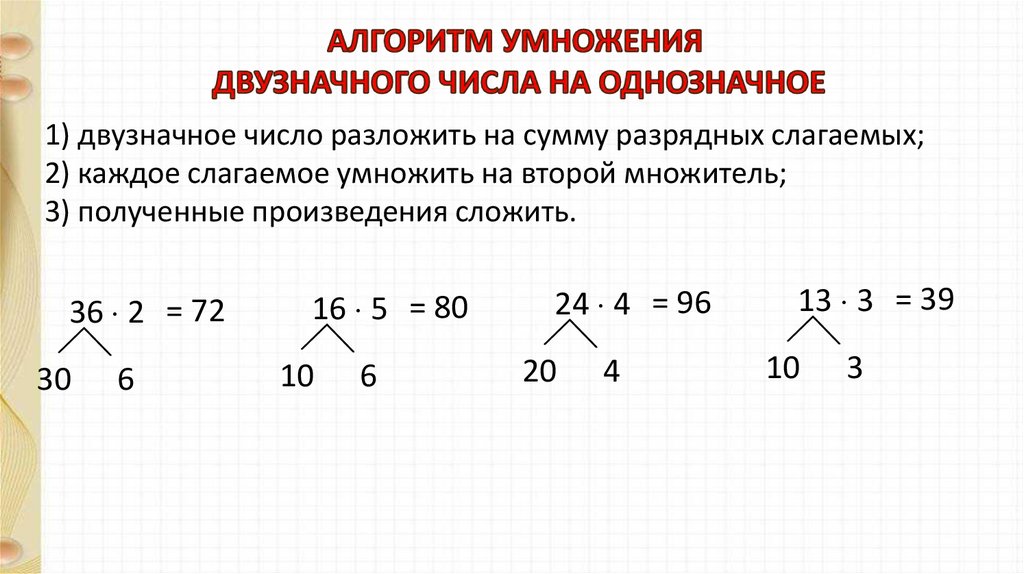 1) двузначное число разложить на сумму разрядных слагаемых;2) каждое слагаемое умножить на второй множитель;