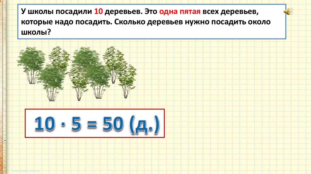 У школы посадили 10 деревьев. Это одна пятая всех деревьев,которые надо посадить. Сколько деревьев нужно посадить около