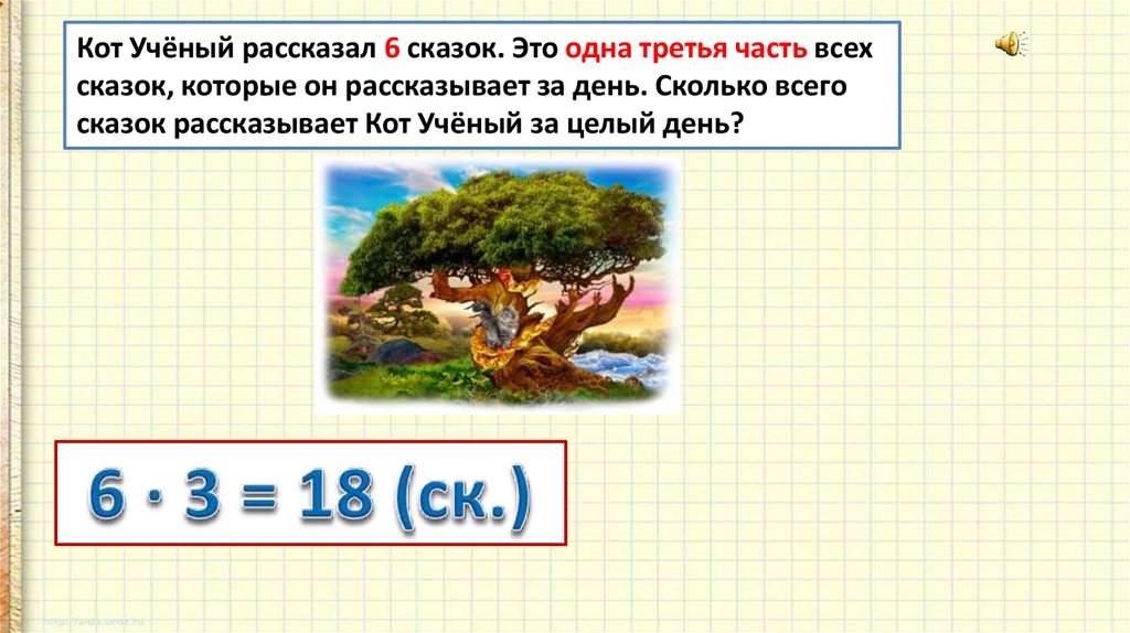 Кот Учёный рассказал 6 сказок. Это одна третья часть всехсказок, которые он рассказывает за день. Сколько всего