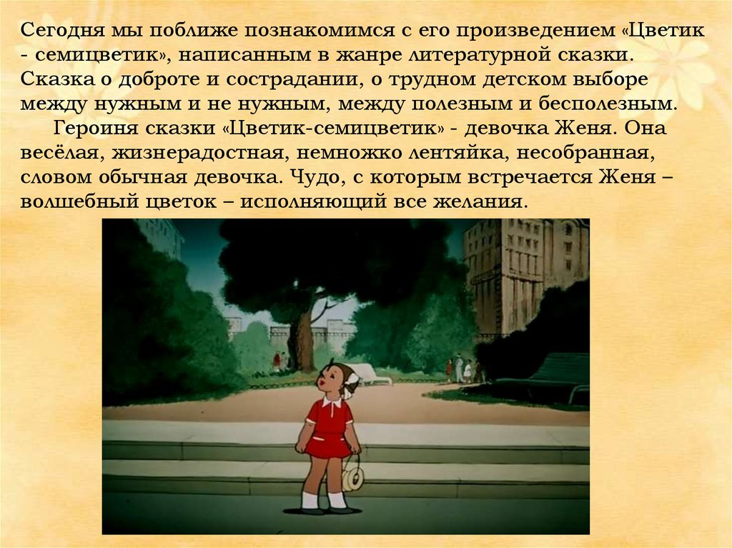 Сегодня мы поближе познакомимся с его произведением «Цветик- семицветик», написанным в жанре литературной сказки.