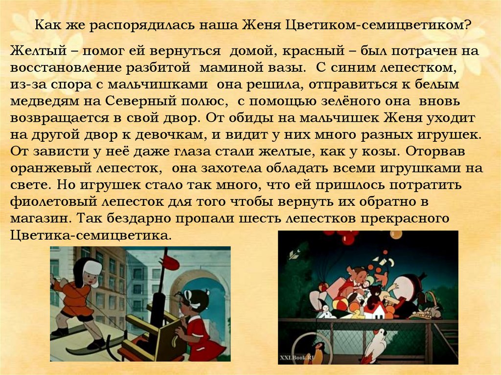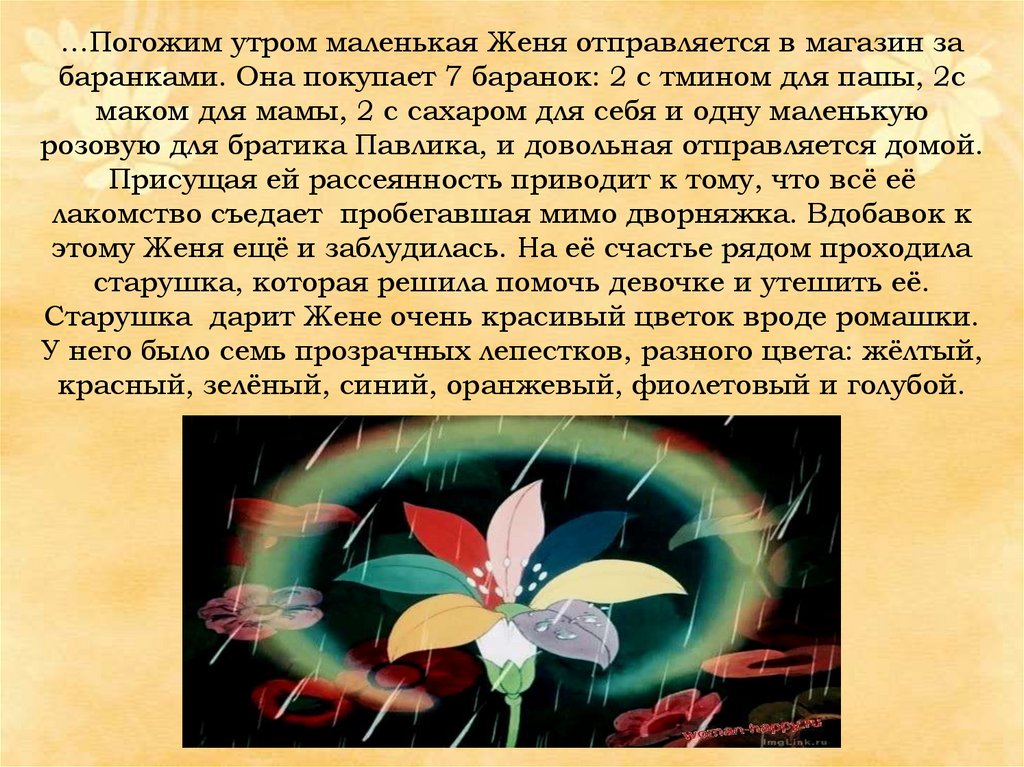 Как же распорядилась наша Женя Цветиком-семицветиком?Желтый – помог ей вернуться домой, красный – был потрачен на