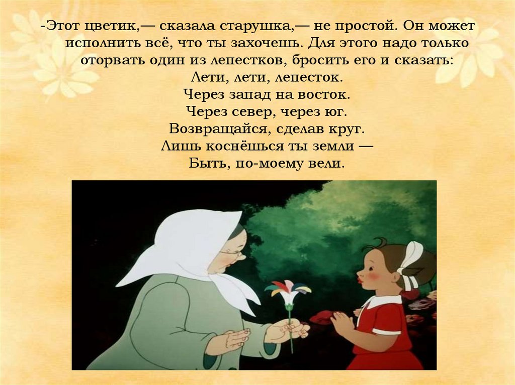 -Этот цветик,— сказала старушка,— не простой. Он можетисполнить всё, что ты захочешь. Для этого надо только