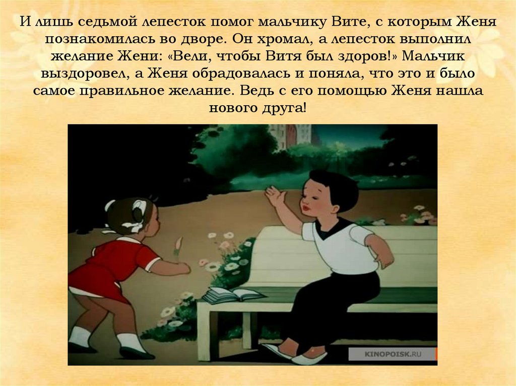 И лишь седьмой лепесток помог мальчику Вите, с которым Женяпознакомилась во дворе. Он хромал, а лепесток выполнил