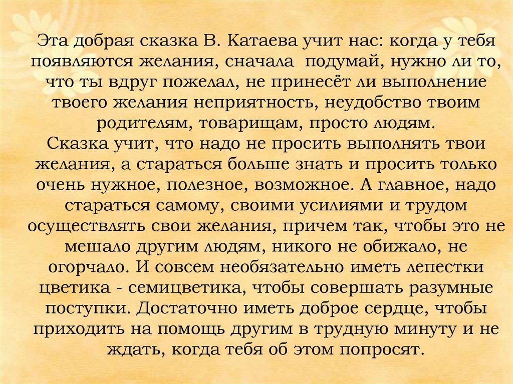 Эта добрая сказка В. Катаева учит нас: когда у тебяпоявляются желания, сначала подумай, нужно ли то,