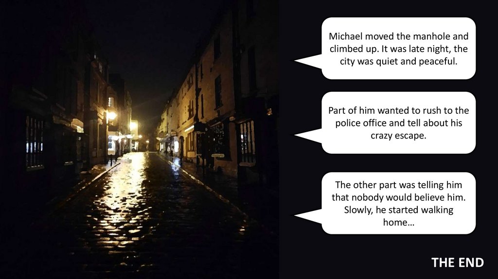 Michael moved the manhole andclimbed up. It was late night, the