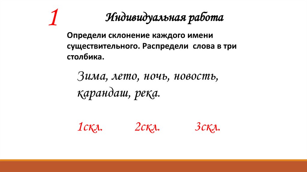 Определи склонение существительных. Исключи
