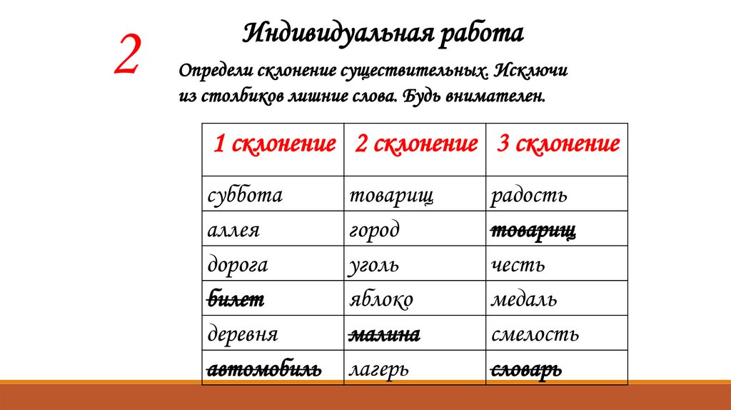 Определи склонение существительных. Исключи из