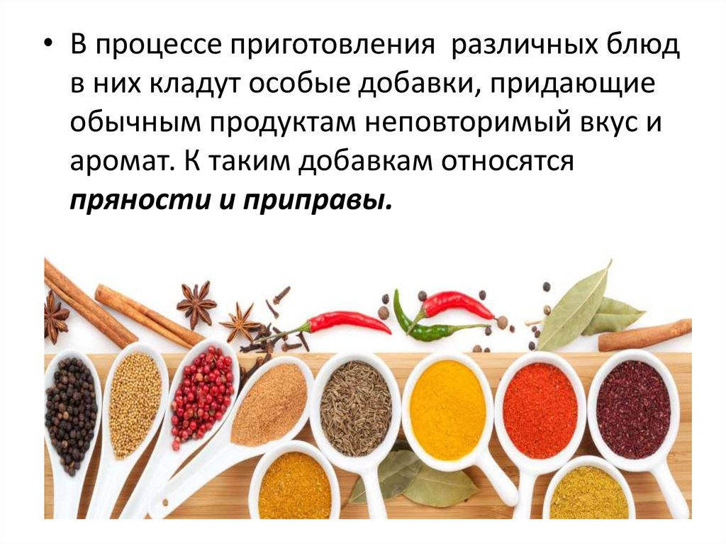 • В процессе приготовления различных блюдв них кладут особые добавки, придающие