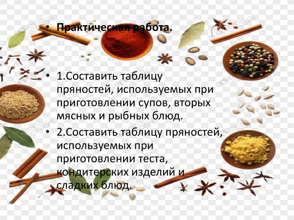Выполните задание. Составьте по предложенному примерутаблицу применения пряностей и приправ в кулинарии.