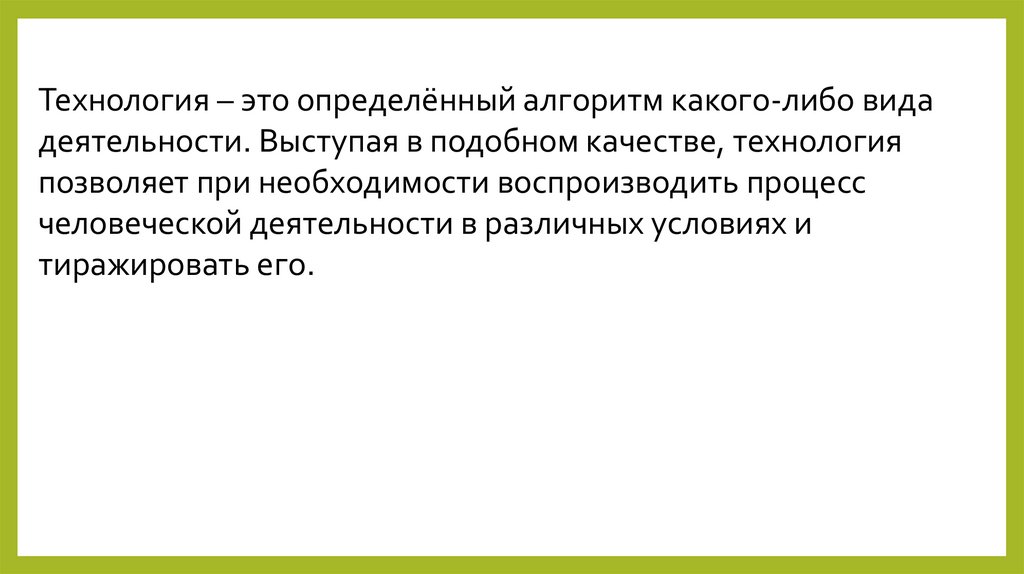 Технология – это определённый алгоритм какого-либо видадеятельности. Выступая в подобном качестве, технология