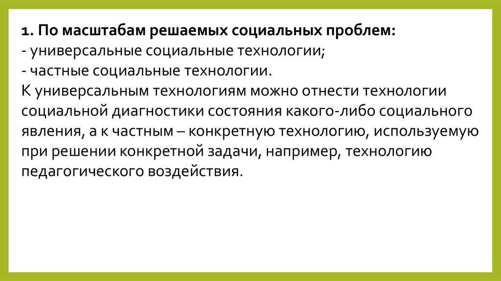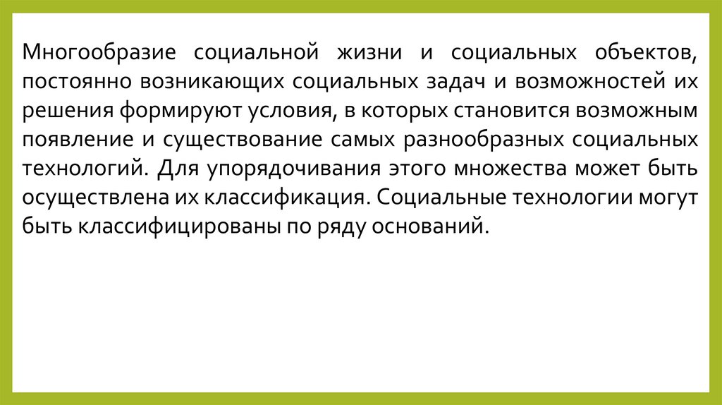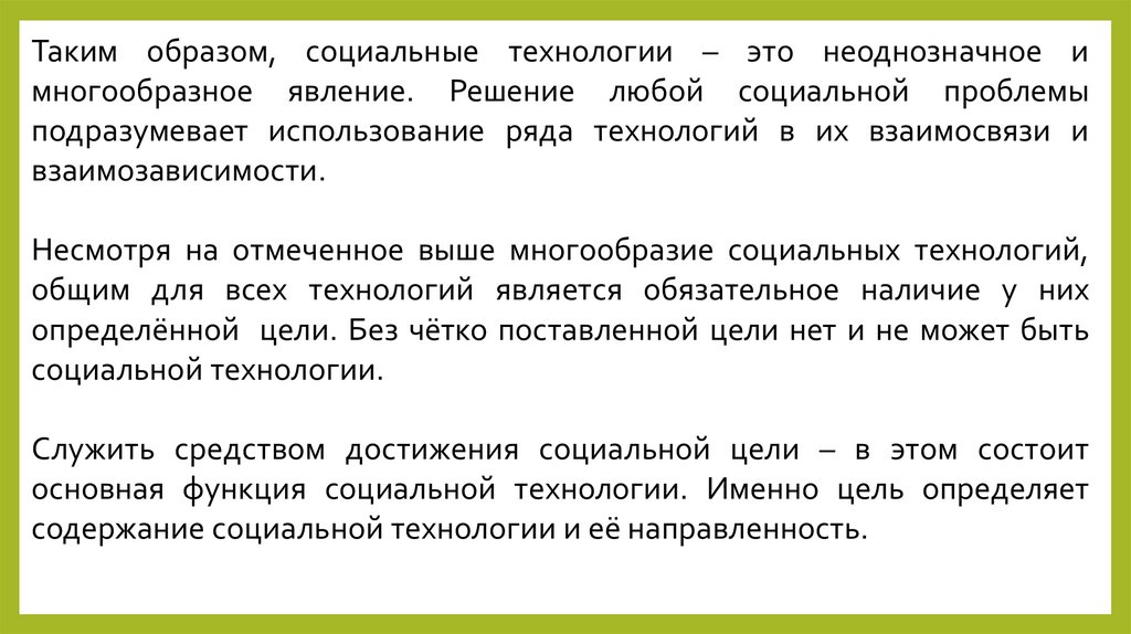 Таким образом, социальные технологии – это неоднозначное имногообразное явление. Решение любой социальной проблемы