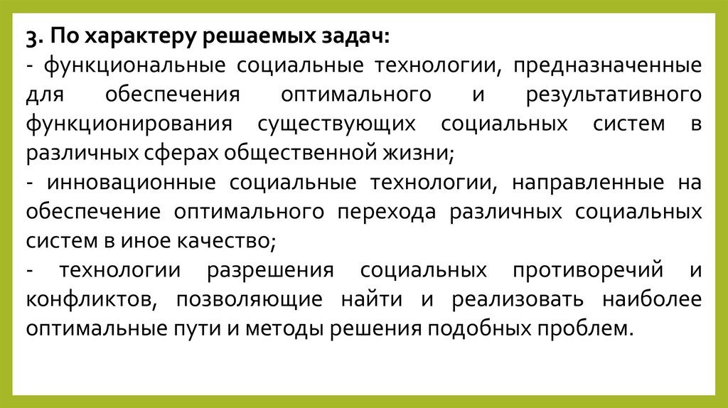 3. По характеру решаемых задач:- функциональные социальные технологии, предназначенные