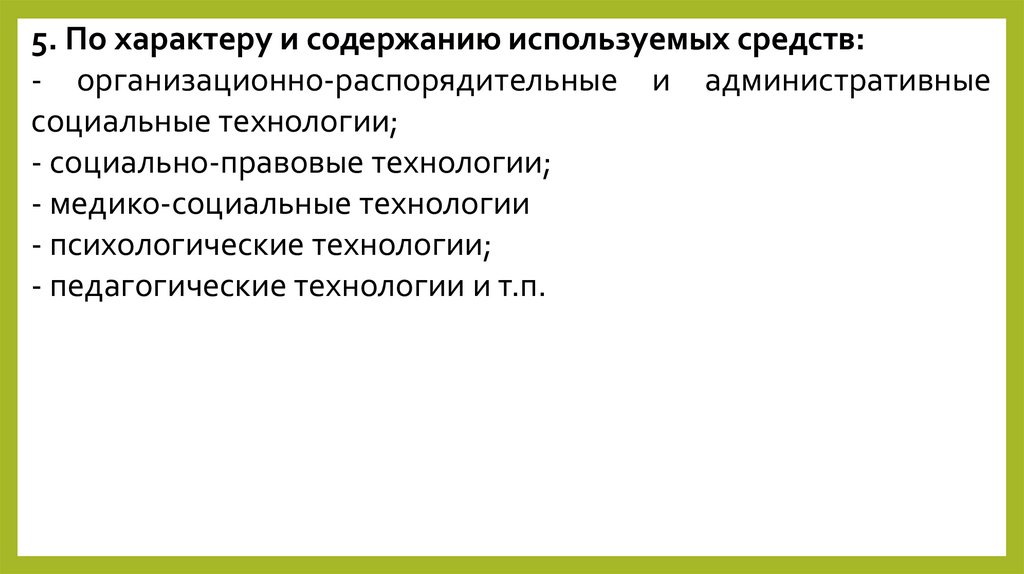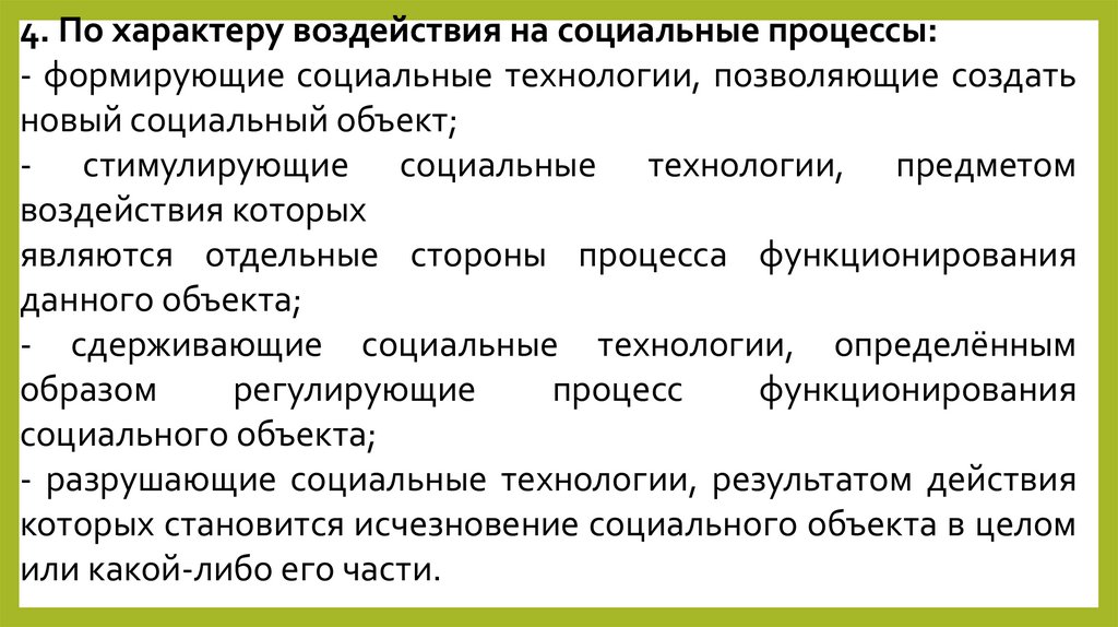 4. По характеру воздействия на социальные процессы:- формирующие социальные технологии, позволяющие создать