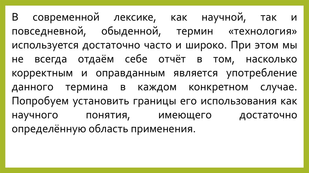 В современной лексике, как научной, так иповседневной, обыденной, термин «технология»