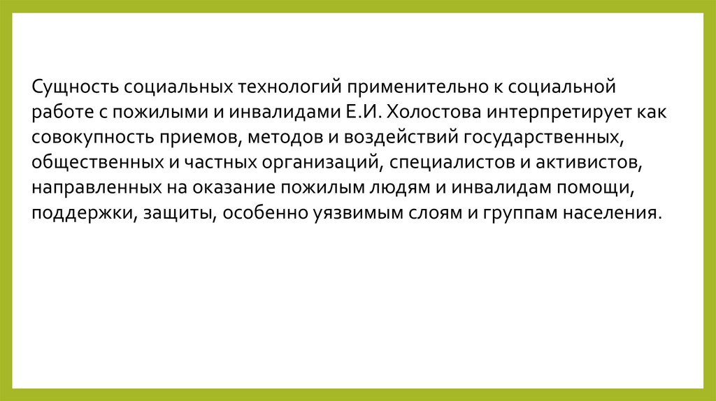 Сущность социальных технологий применительно к социальнойработе с пожилыми и инвалидами Е.И. Холостова интерпретирует как