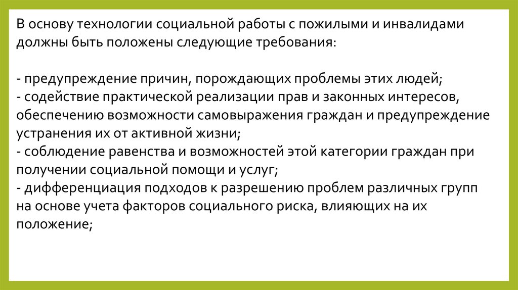 В основу технологии социальной работы с пожилыми и инвалидамидолжны быть положены следующие требования:
