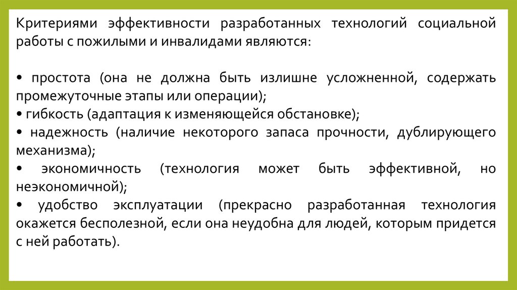Критериями эффективности разработанных технологий социальнойработы с пожилыми и инвалидами являются: