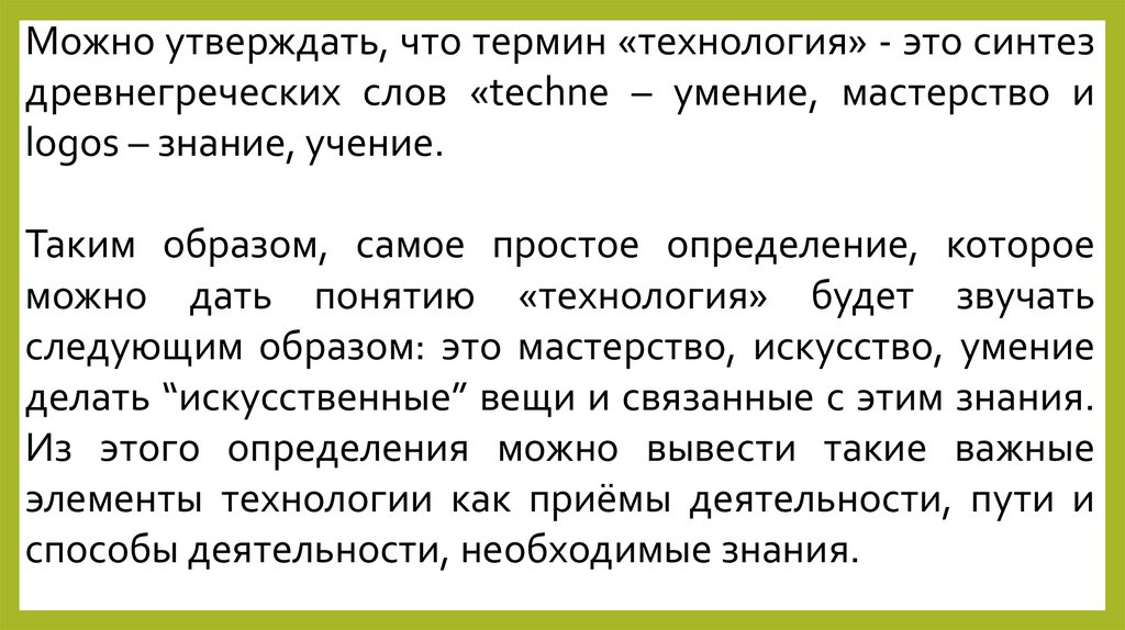 Можно утверждать, что термин «технология» - это синтездревнегреческих слов «techne – умение, мастерство и