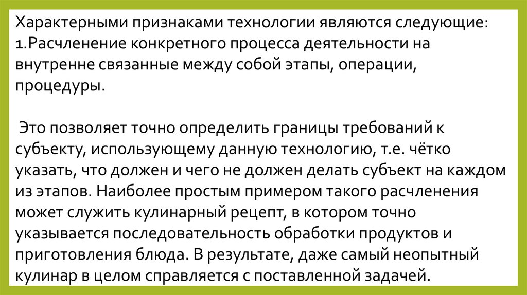 Характерными признаками технологии являются следующие:1.Расчленение конкретного процесса деятельности на