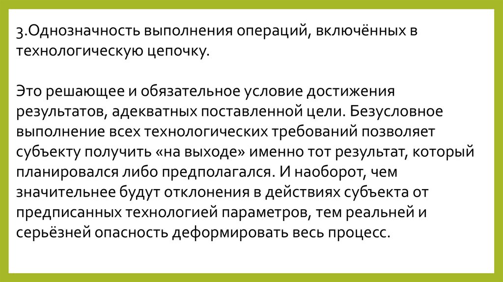3.Однозначность выполнения операций, включённых втехнологическую цепочку.
