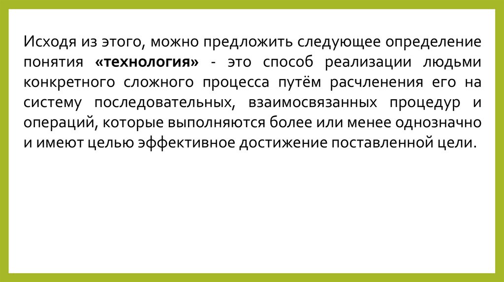 Исходя из этого, можно предложить следующее определениепонятия «технология» - это способ реализации людьми