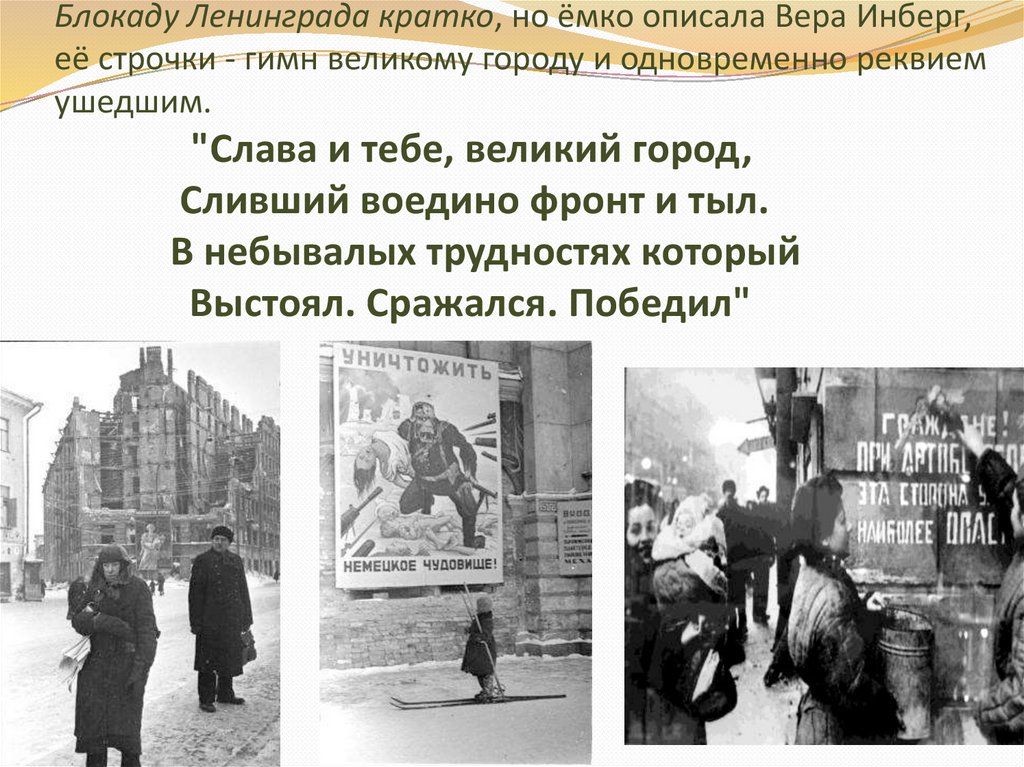 Блокаду Ленинграда кратко, но ёмко описала Вера Инберг,её строчки - гимн великому городу и одновременно реквием