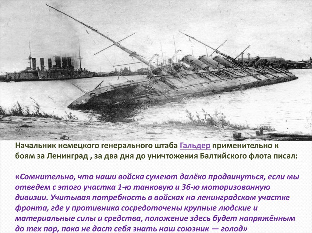 Начальник немецкого генерального штаба Гальдер применительно кбоям за Ленинград , за два дня до уничтожения Балтийского флота писал: