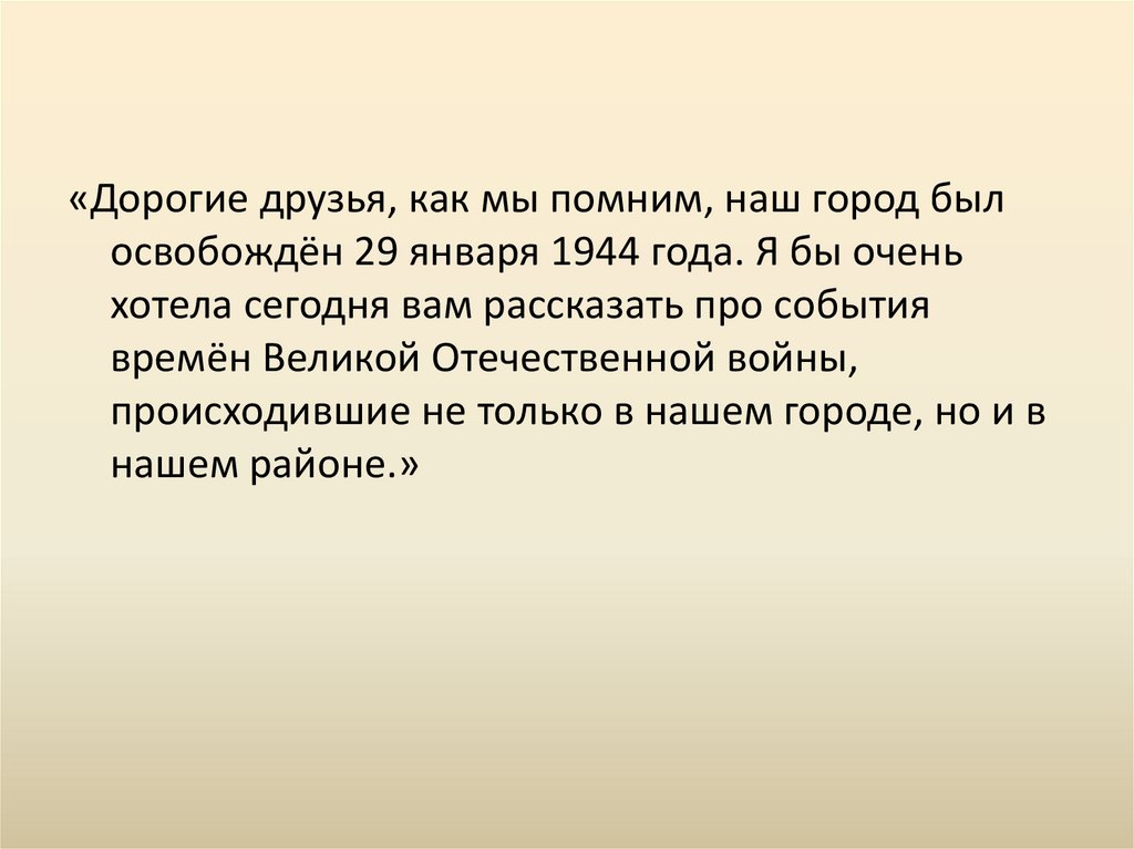 «Дорогие друзья, как мы помним, наш город былосвобождён 29 января 1944 года. Я бы очень