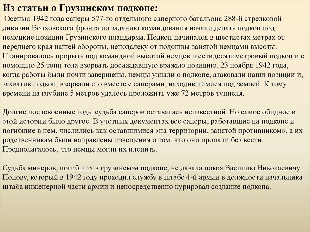 Из статьи о Грузинском подкопе:Осенью 1942 года саперы 577-го отдельного саперного батальона 288-й стрелковой