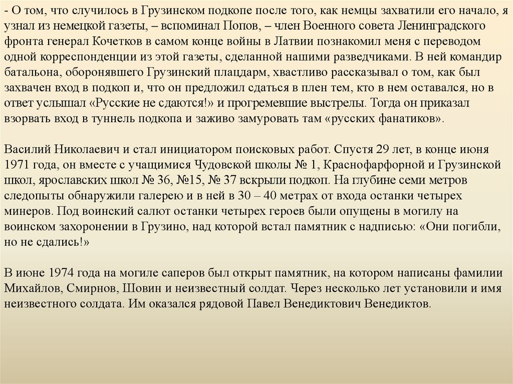 - О том, что случилось в Грузинском подкопе после того, как немцы захватили его начало, яузнал из немецкой газеты, – вспоминал Попов, – член Военного совета Ленинградского