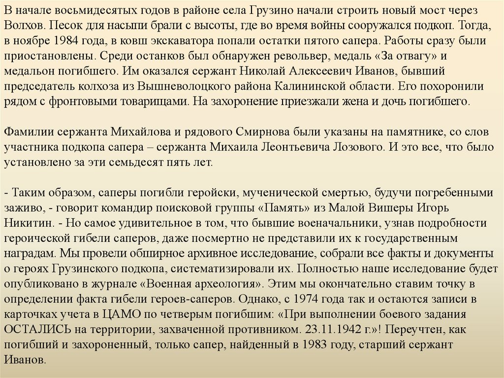 - Таким образом, саперы погибли геройски, мученической смертью, будучи погребенными