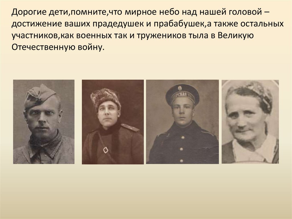 Дорогие дети,помните,что мирное небо над нашей головой –достижение ваших прадедушек и прабабушек,а также остальных