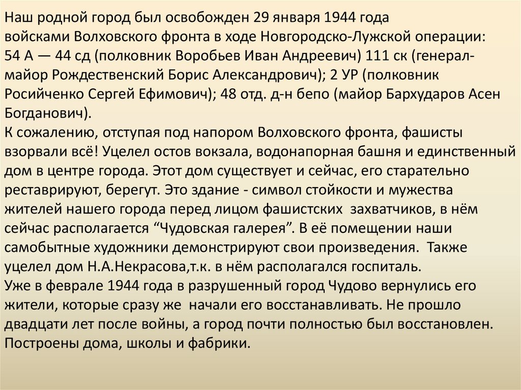 Наш родной город был освобожден 29 января 1944 годавойсками Волховского фронта в ходе Новгородско-Лужской операции: