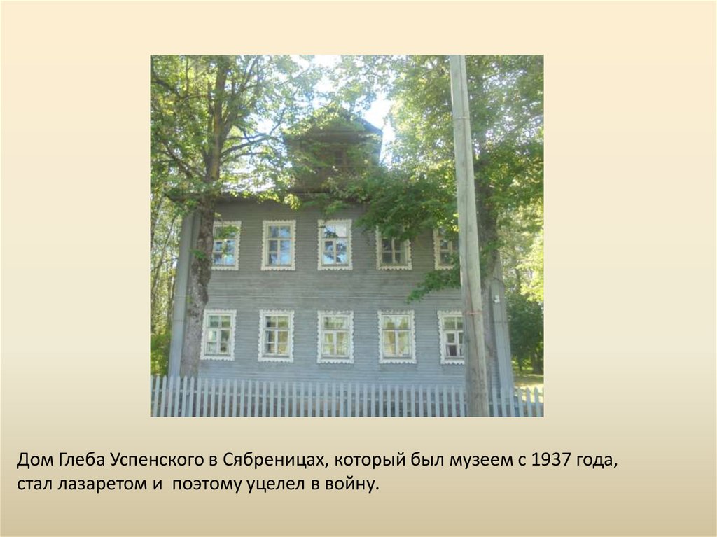 Дом Глеба Успенского в Сябреницах, который был музеем с 1937 года,стал лазаретом и поэтому уцелел в войну.