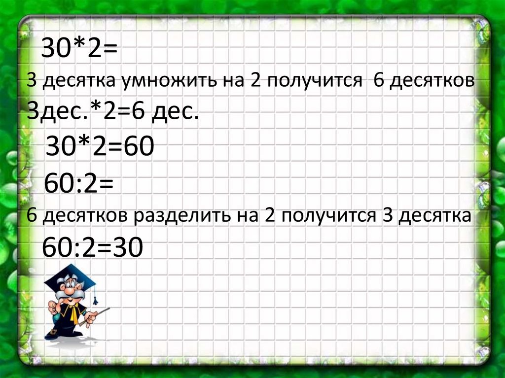 30*2=3 десятка умножить на 2 получится 6 десятков