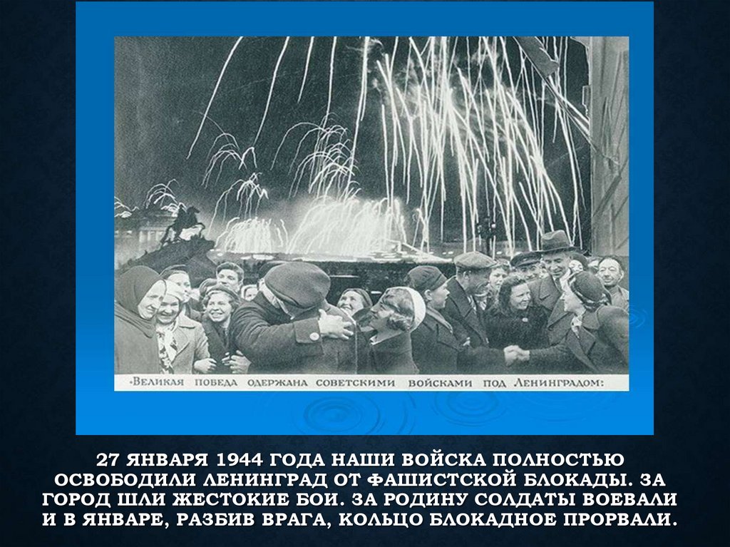 27 ЯНВАРЯ 1944 ГОДА НАШИ ВОЙСКА ПОЛНОСТЬЮОСВОБОДИЛИ ЛЕНИНГРАД ОТ ФАШИСТСКОЙ БЛОКАДЫ. ЗА