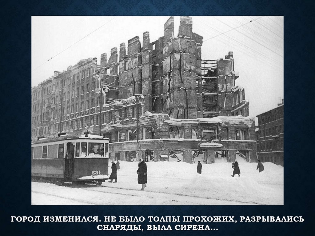 ОХВАЧЕННЫЙ ВОЙНОЮ ЛЕНИНГРАД. НА УЛИЦАХ ТРАМВАИЗАМЕРЗШИЕ СТОЯТ. РАЗРУШЕННЫЕ ЗДАНИЯ И НАДПИСЬ НА