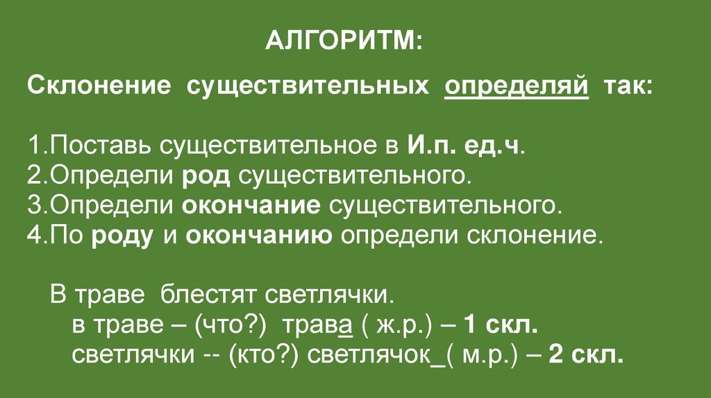 АЛГОРИТМ:Склонение существительных определяй так: