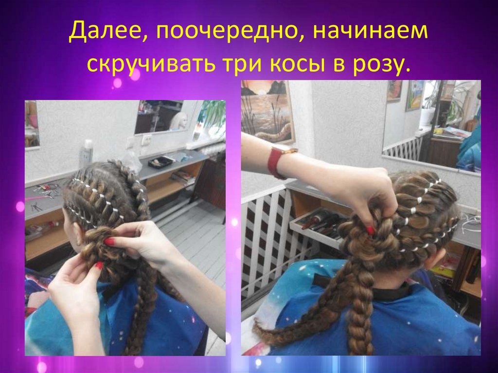 Далее, поочередно, начинаемскручивать три косы в розу.
