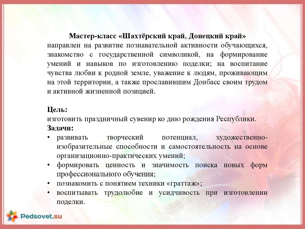 Мастер-класс «Шахтёрский край, Донецкий край»направлен на развитие познавательной активности обучающихся,
