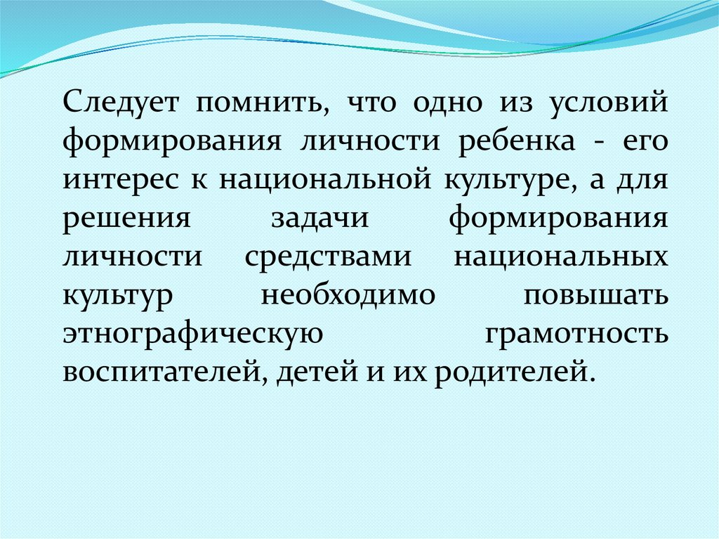 Следует помнить, что одно из условийформирования личности ребенка - его