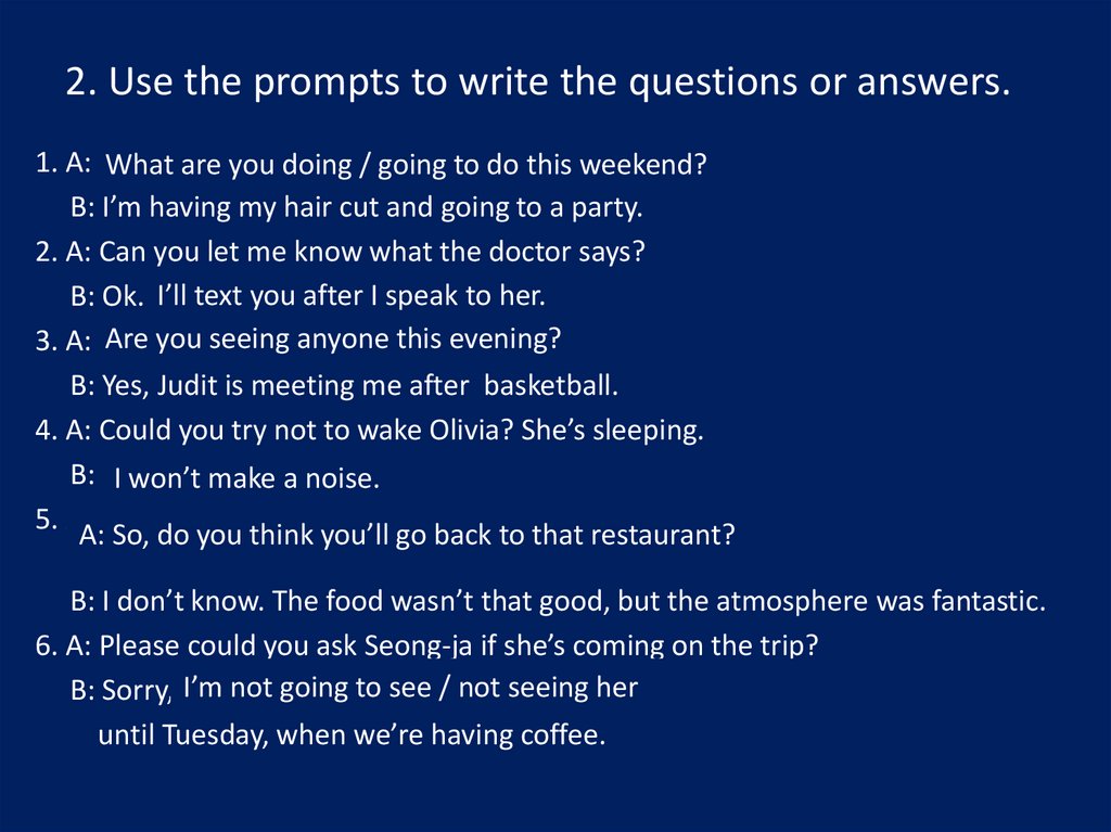 2. Use the prompts to write the questions or answers.1. A: ____________________?
