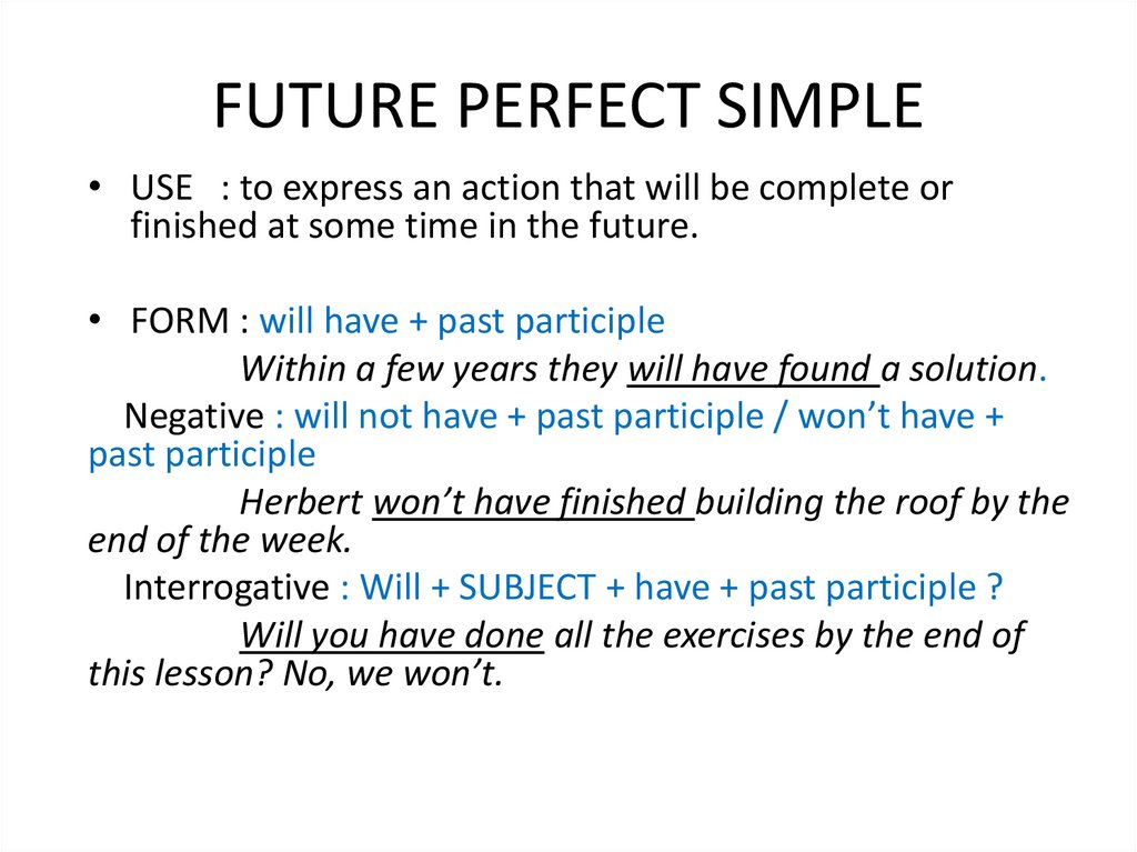 FUTURE PERFECT SIMPLE• USE : to express an action that will be complete or