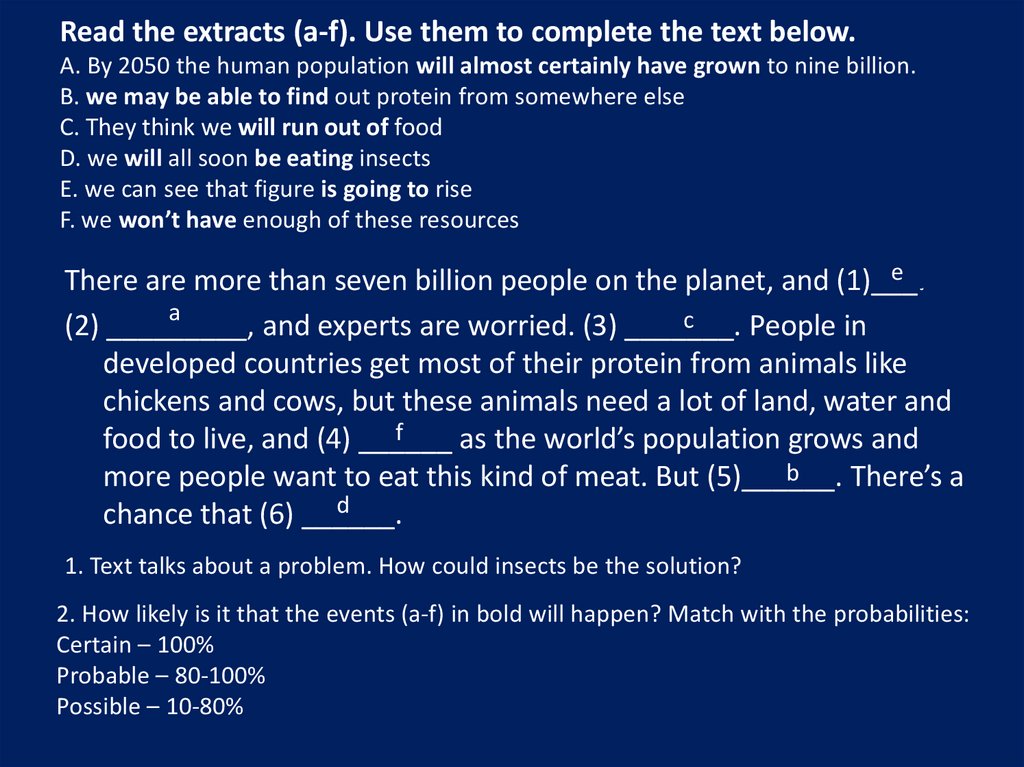 Read the extracts (a-f). Use them to complete the text below.A. By 2050 the human population will almost certainly have grown to nine billion.
